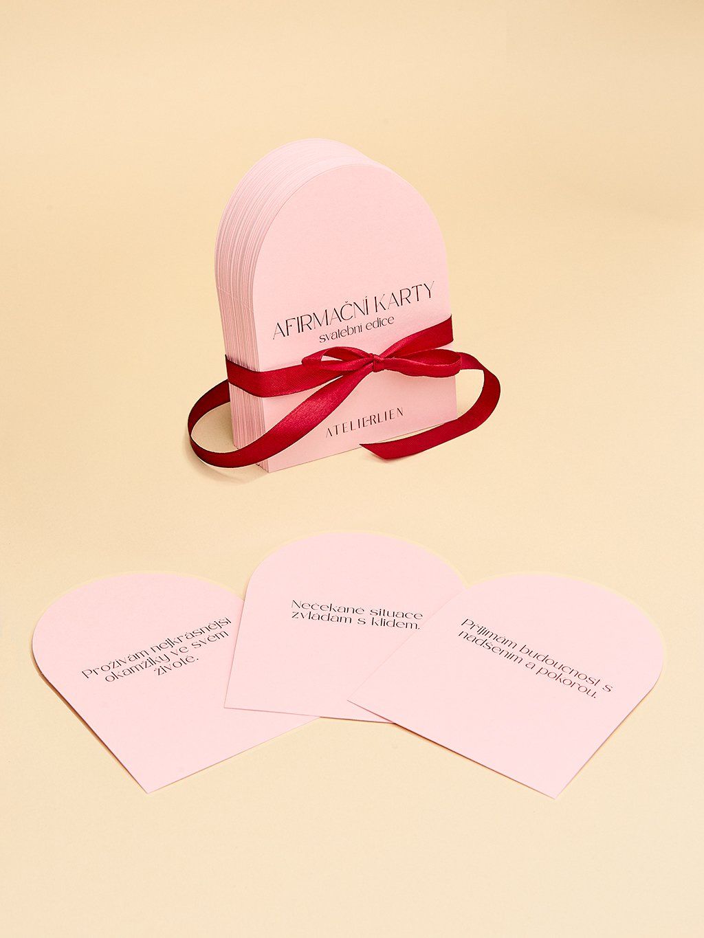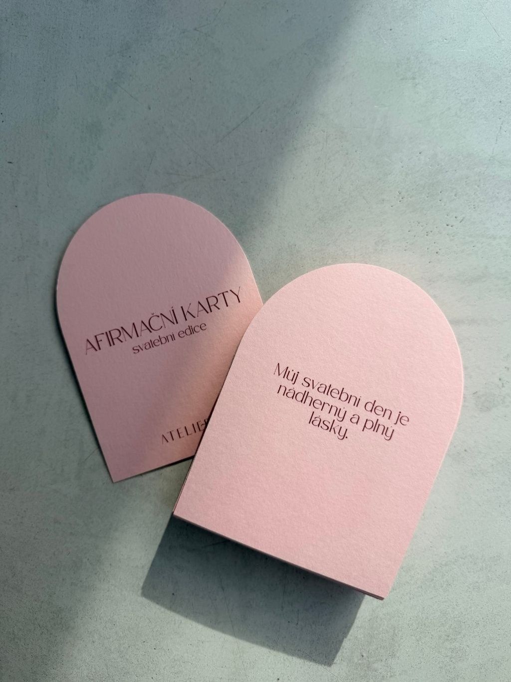 Karty jsou navrženy tak, aby se přirozeně staly součástí každodenních svatebních příprav. Jsou oříznuté do jemného obloukového tvaru a vytištěné na prémiovém barevném strukturovaném papíru vysoké gramáže, který podtrhuje jejich slavnostní a elegantní charakter.