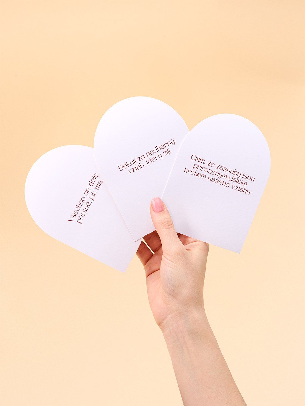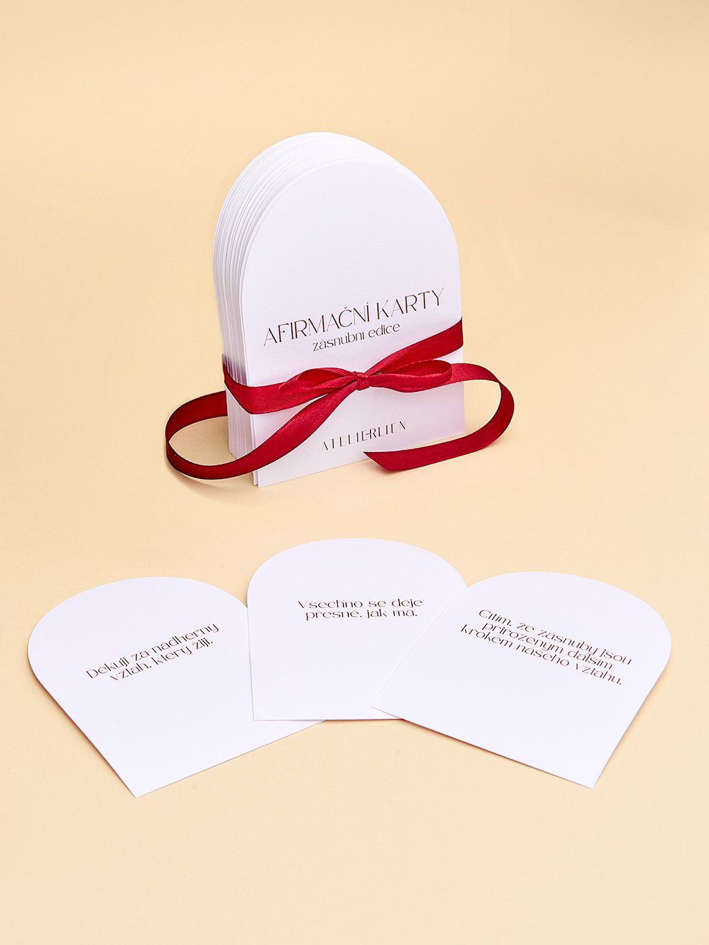 Karty jsou navrženy tak, aby se přirozeně staly součástí vašeho každodenního života. Jsou oříznuté do jemného obloukového tvaru a vytištěné na prémiovém barevném strukturovaném papíru vysoké gramáže, který podtrhuje jejich kvalitu i slavnostní charakter.